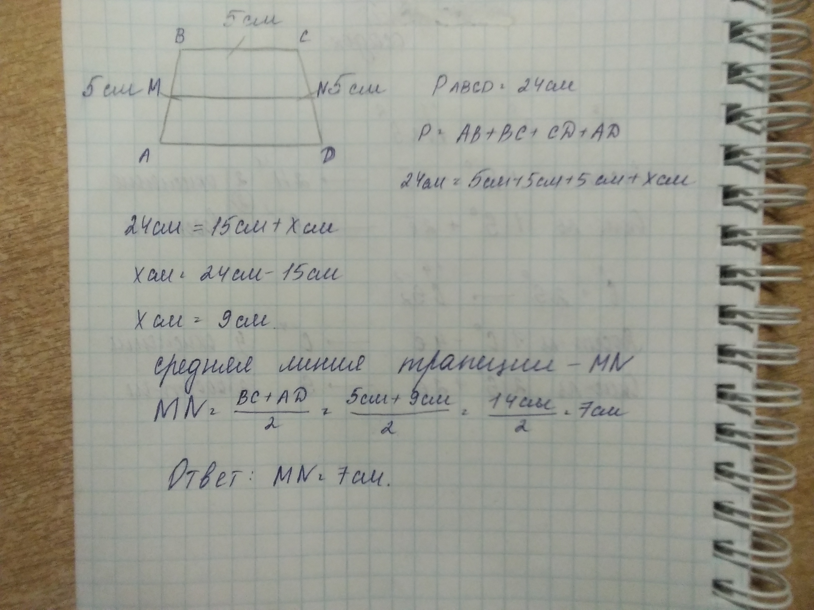 Длина средней линии трапеции равна половине суммы длин оснований. Периметр данной трапеции 24 см. Боковые стороны равны между собой, их длина по 5 см каждая. Полная сумма оснований равна 24-2•5=14 см. Полусумма оснований=средняя линия=14:2=7 см
