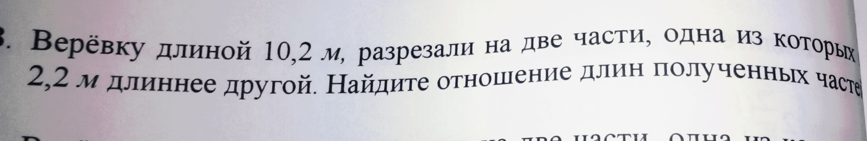 1) 10,2 - 2,2=8 м - длина веревки, если бы части были равны