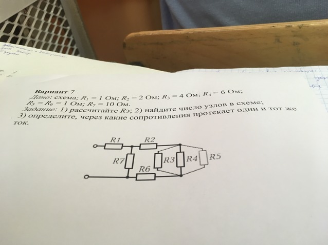 Реш: Всего узлов 4. назовём узел А-это соединение R1,R2,R7. B-R2, и R345, C-R6, и R345, D-7, R6, ; группа резисторов R345=0.706om, сумма последовательного соединения от А до D, назовём Rad=R2+R345+R6=2+0.706+1=3.706om,
