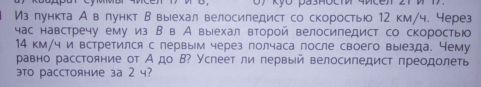 - 14 км/ч * 0,5 ч = 7 (км) - проехал второй велосипедист за полчаса