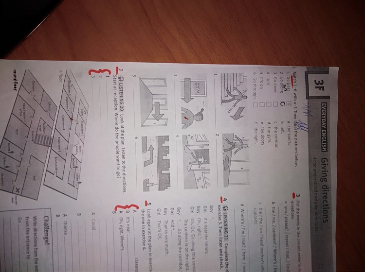 1 - d (the gym) 2 - c (the corridor) 3 - a ( the stairs) 4 - b (left) 5 - f (the right) 6 - e (the doors)