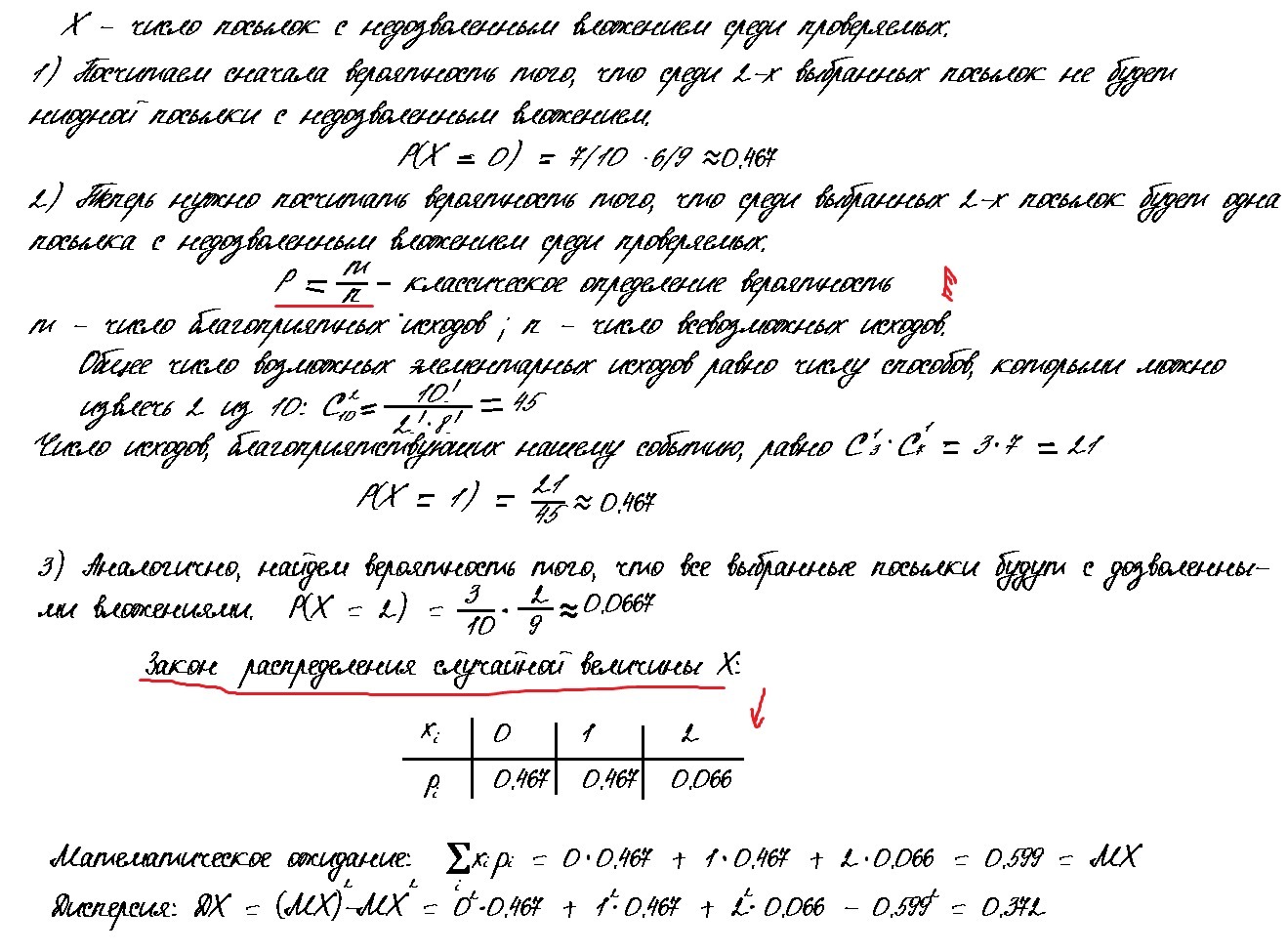 Среди 10 посылок, отправляемых по почте, в трех есть недозволенные вложения. Работник почтамта проверяет наугад содержимое двух посылок. Пусть X - число посылок с недозволенным вложением среди проверяемых. Составить закон распределения случайной величины X. Найти математическое ожидание и дисперсию этой случайной величины.