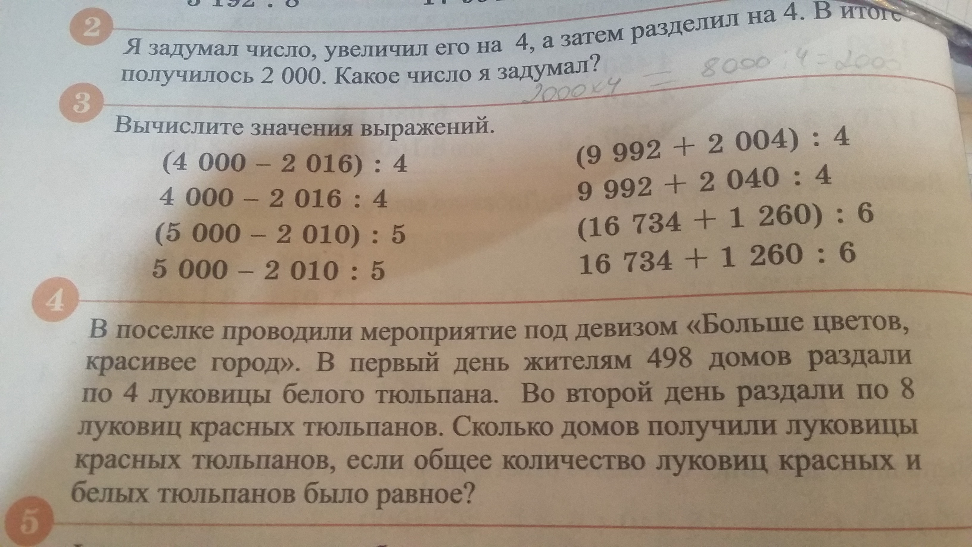1) 498•4=1992(л.) - белых тюльпанов раздали жителям 498 домов.