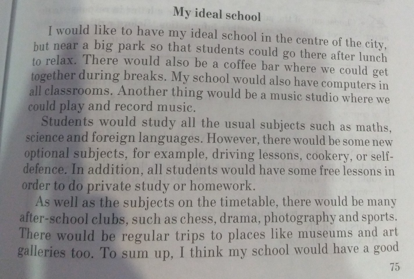 Моя идеальная школа Я хотел бы иметь свою идеальную школу в центре города. но рядом с большим парком, чтобы студенты могли пойти туда после обеда, чтобы расслабиться. Также будет кафе-бар, где мы могли бы вместе во время перерывов. В моей школе также будут компьютеры во всех классах. Другое дело - музыкальная студия, где мы могли бы играть и записывать музыку. Студенты будут изучать все обычные предметы, такие как математика, естественные науки и иностранные языки. Однако появятся некоторые новые факультативные предметы, например, уроки вождения, кулинария или самооборона. Кроме того, у всех учеников будет несколько бесплатных уроков для самостоятельного изучения или выполнения домашних заданий. Помимо предметов из расписания, будет много кружков после уроков, таких как шахматы, драма, фотография и спорт. Также будут регулярные поездки в такие места, как музеи и художественные галереи. Подводя итог, я думаю, что моя школа получила бы
