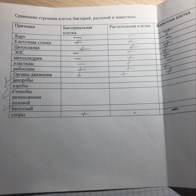 Бесполое размножение у бактерий, может присутствовать у растений (но опять же плюс-минус нельзя поставить (?), ставь минус у растений) и отсутствует у животных.