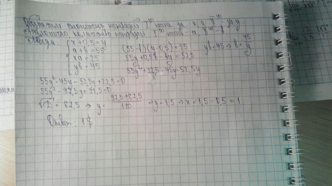 Мальчик купил 55 тетрадей двух типов. За тетради первого типа было уплачено 25$ ,а за второго типа 45$. Сколько стоили тетради первого типа, если они дешевле тетрадей второго типа на 0.5$