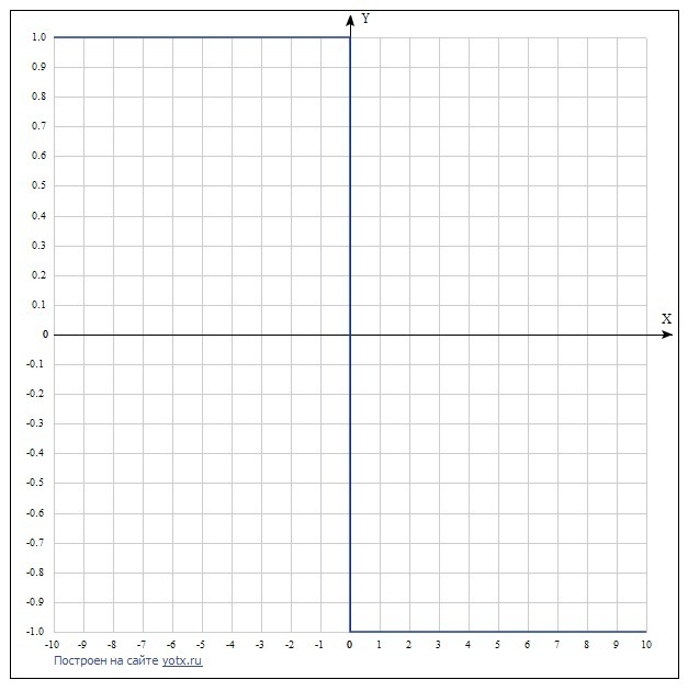 т.к есть отрицательный модуль, то какое бы мы число не поставили, оно будет отрицательно. Значет отображаем соответсвенно ту часть графика, которая была положительной (2 случай при x > 0), с y = 1, отобразивши, получится y = -1. Получившийся график совпадает с графиком 1 случая при x < 0, имеем в итоге: