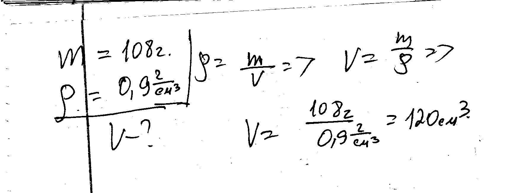 Дано: масса = 108 г ., по таблице плотности твёрдых тел плотность льда = 0,90 г/см кубических найти: объём Решение: формула чтобы найти объём надо массу разделить на плотность. объём равен 108 : 0,90 = 120 значит объём 120 грамм или 0,12 килограмм