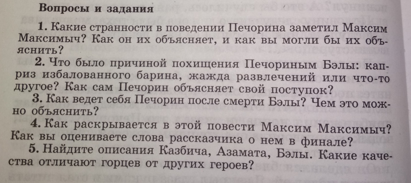 1.Он странно себя вел ,был странно одет ,в один и тот же момент его настроение могло измениться .Он однажды влюбился в Беллу но когда добился ее внимания он к ней стал равнодушен ,и принял ее смерть равнодушием .;2)Она ему понравилась он ее увидел на свадьбе и предложил коня в обмен на Беллу ,это не была любовь это была влеченность .3)Он принял ее смерть равнодушно ,когда она умерла по его глазам покатились слезы ,через день он забыл про это ;4)Максим Максимыч раскрывается в образе доброго друга и товарища Печорину и автору;5)Казбич был жаден ,и скуп продал сестру за лошадь но потом хотел вернуть ,Белла милая добрая красивая девушка