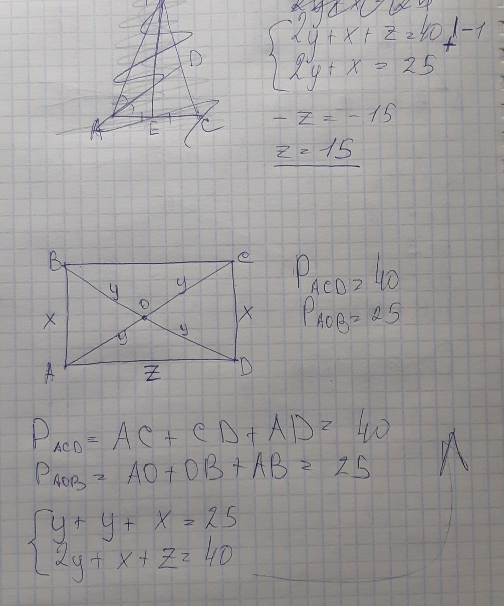 АВСD-прямоугольник. Диагонали АC и ВD пересекаются в точке О. Найдите АD если Периметр АОВ=25,периметр АСD=40
