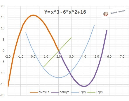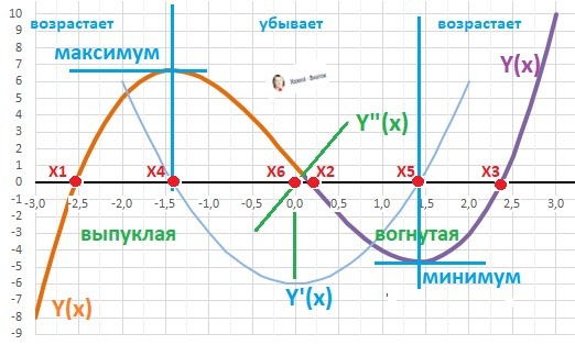 ВАЖНО: Вторая производная Y"(x)<0 - функция выпуклая ("горка"), Y"(x)>0 - вогнутая ("ложка"). Точка перегиба находится посередине между экстремумами.