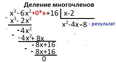 свободный член уравнения (+16) является произведением всех трёх корней: х₁*х₂*х₃ = 16. Например, 16 = 2*8. Возможно х₂= 2 корень. Делим многочлен Y(x) на (х-2) - "в столбик". Расчет приведен на рисунке в приложении. Остатка при делении нет - значение х = 2 - один из нулей функции. Первый этап разложения: Y(х)= x³-6*x²+16 = (x-2)*(x²-4*x-8)