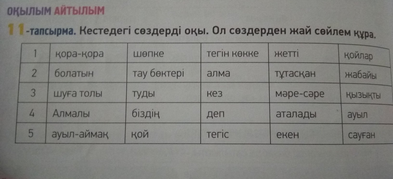 Үйінде қора-қора мал бар.Кешке шөпке шығамыз.Оның тегін көкке жеткізді.Үйіне аман-есен жетті.Қойлар жайлаудан келді.Жеуге болатын нәрсе.Керемет тау бөктері кездеседі.Алма ағашы жемісін берді.Бір-бірімен өте қатты тұтасқан.Жабайы аңдар орманда көп кездеседі.Шуға толы аймақ.Арманда бір ой туды.Самат бұрынғы досымен кез болды.Мерекені мәре-сәре болып өткізді.Қызықты суреттер бар.Алматы-үлкен қала.Біздің мектеп жақсы.Сарыарқа деп айтады.Аңыз деп аталады.Ауыл іші тыныш.Ауыл-аймақ дамуда.Қой-өте момын.Тегіс жерлер бар.Көкшетау көркем екен.Кезінде сиыр сауған.