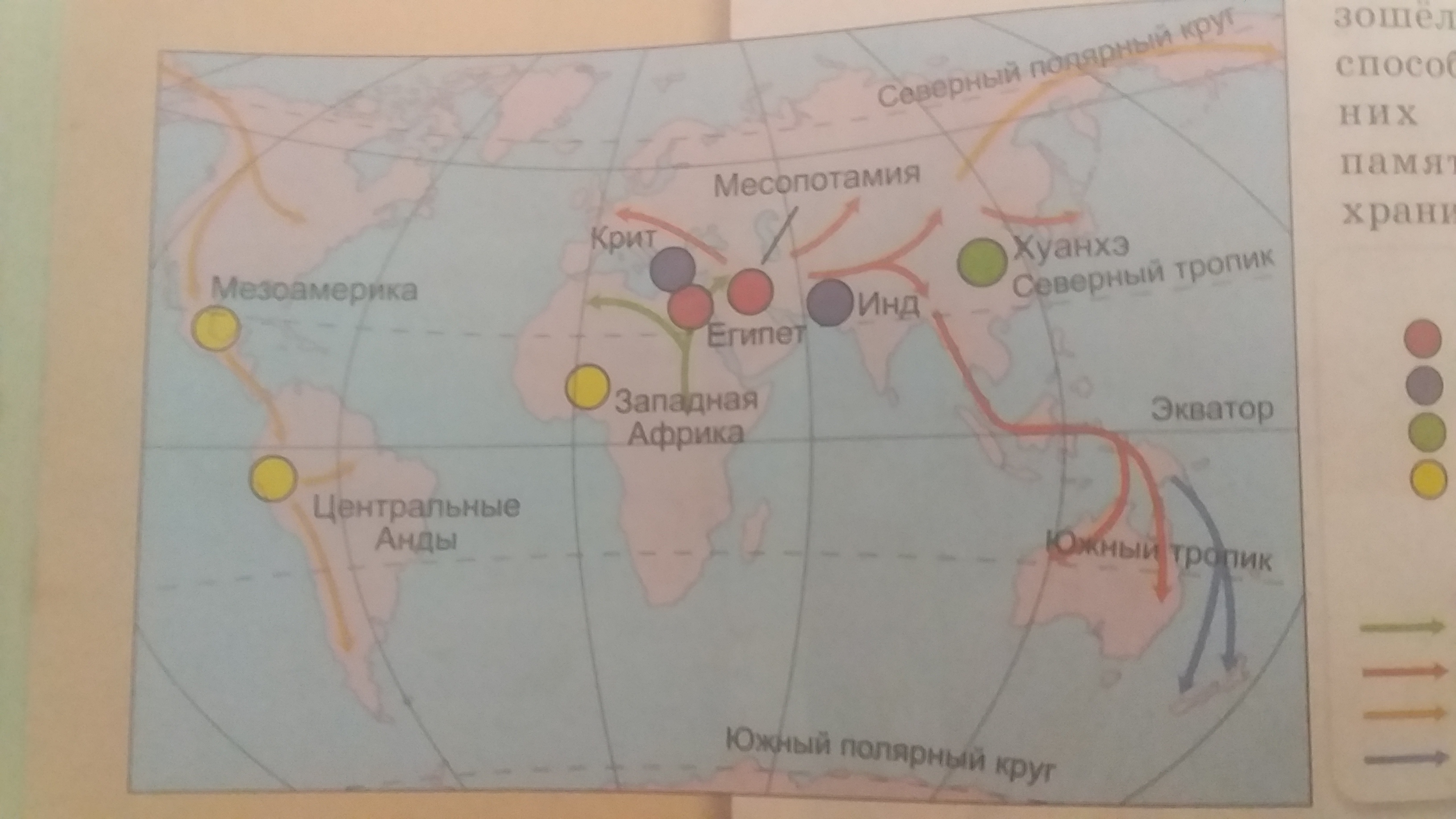 Я пологаю, на данном рисунке, изображена схема расселения людей по планете. Стрелочки - это этапы расселения то есть: 1) зеленая, 2) красная, 3) желтая, 4) синяя. А кружочки, наверно, длительность остановок людей.