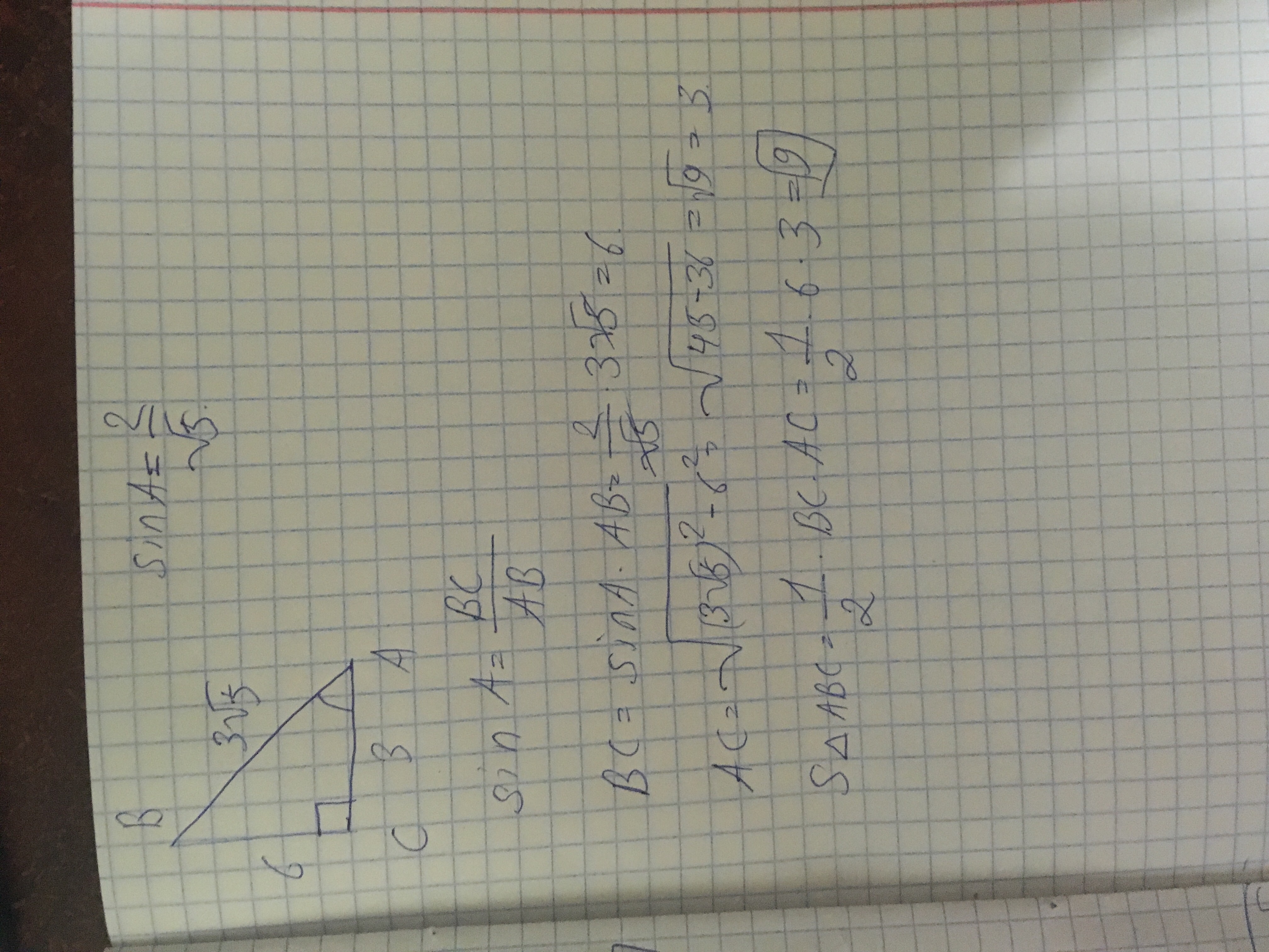 В треугольнике ABC угол C равен 90, AB=3 корня из 5, sin A=2/корня из 5. Найдите площадь треугольника