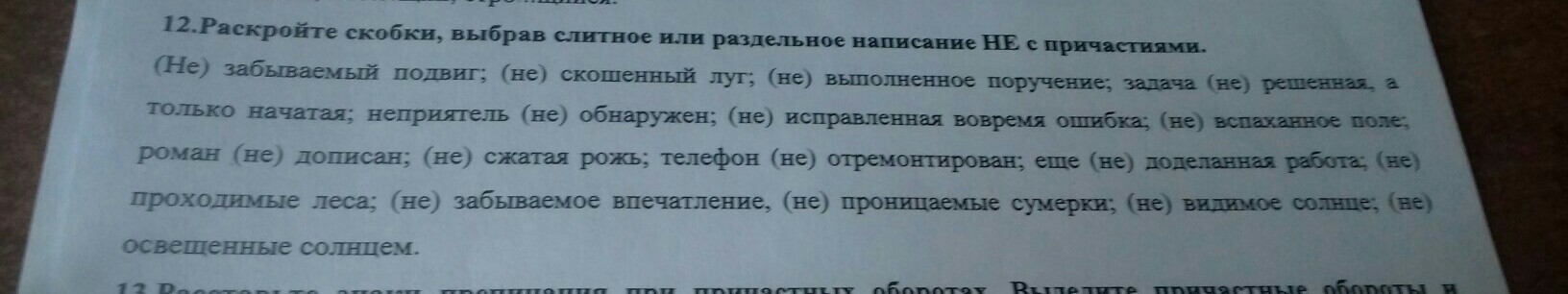 Незабываемый подвиг; нескошенный луг; невыполненное поручение; задача не решённая, а только начатая; неприятель не обнаружен; не исправленная вовремя ошибка; невспаханное поле; роман не дописан; несжатая рожь; телефон не отремонтирован; ещё не доделанная работа; непроходимые леса; незабываемое впечатление; непроницаемые сумерки; невидимое солнце; не освещённые солнцем.