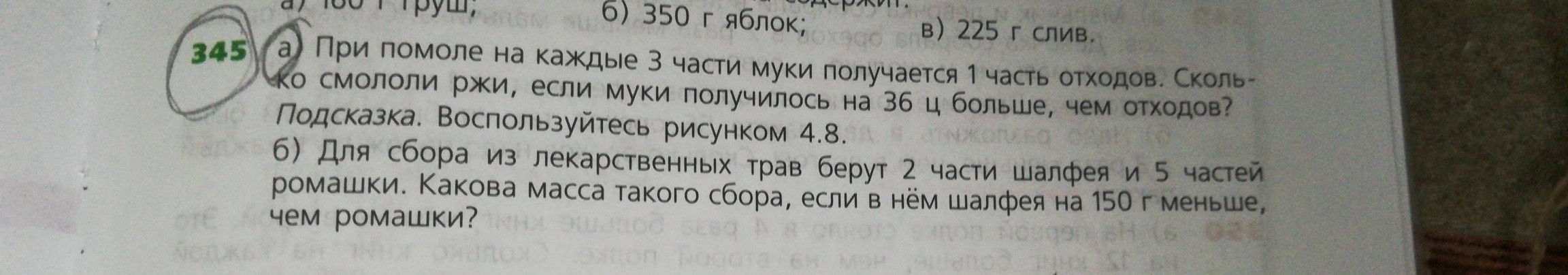 При помоле на каждые 3 части муки получается 1 часть отходов. ... Т. к. по условию задачи муки получилось на 36 ц больше, чем отходов, то 3х-х=36, 2х=36, х=18 - отходы, 18*4=72 (ц) - ржи.
