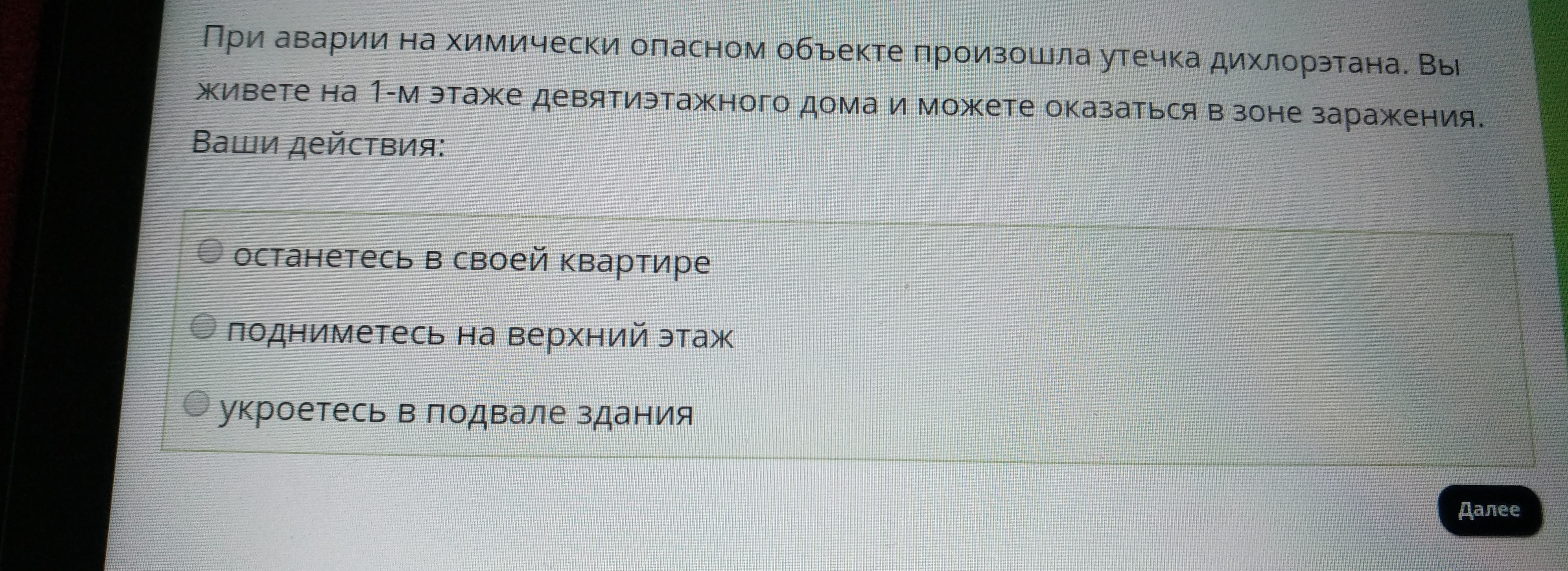 Дихлорэтан тяжелее воздуха, поэтому спускаться в подвал ни в коем случае нельзя. имеет смысл оставаться в квартире, закрыв плотно окна и двери. Подниматься на верхний этаж небезопасно, из-за создания давки на лестничных площадках. однако при первой возможности постарайтесь подняться на верхние этажи.