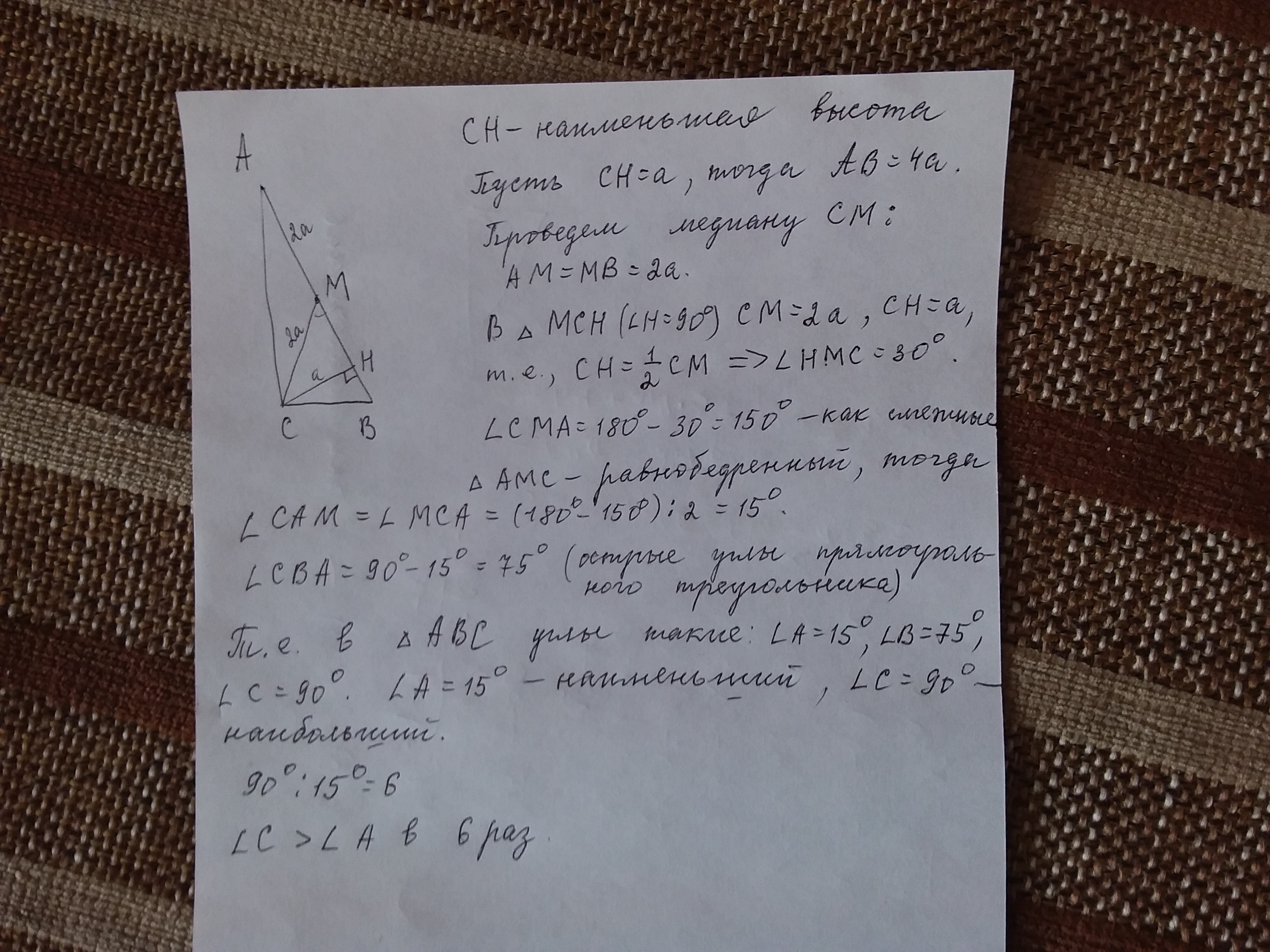в прямоугольном треугольнике наименьший высоты вчетверо короче гипотенузы. Во сколько раз самый большой угол этого треугольника больше самого маленького из углов