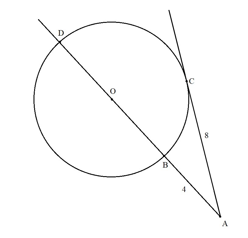 дан круг с центром в точке О. из точки А что не принадлежит этому кругу к ниму провдено касающюю АС и секущую ОА. секущая АО пересекает круг в точках В и D. найти радиус этого круга если АВ=4 см, а АС=8 см