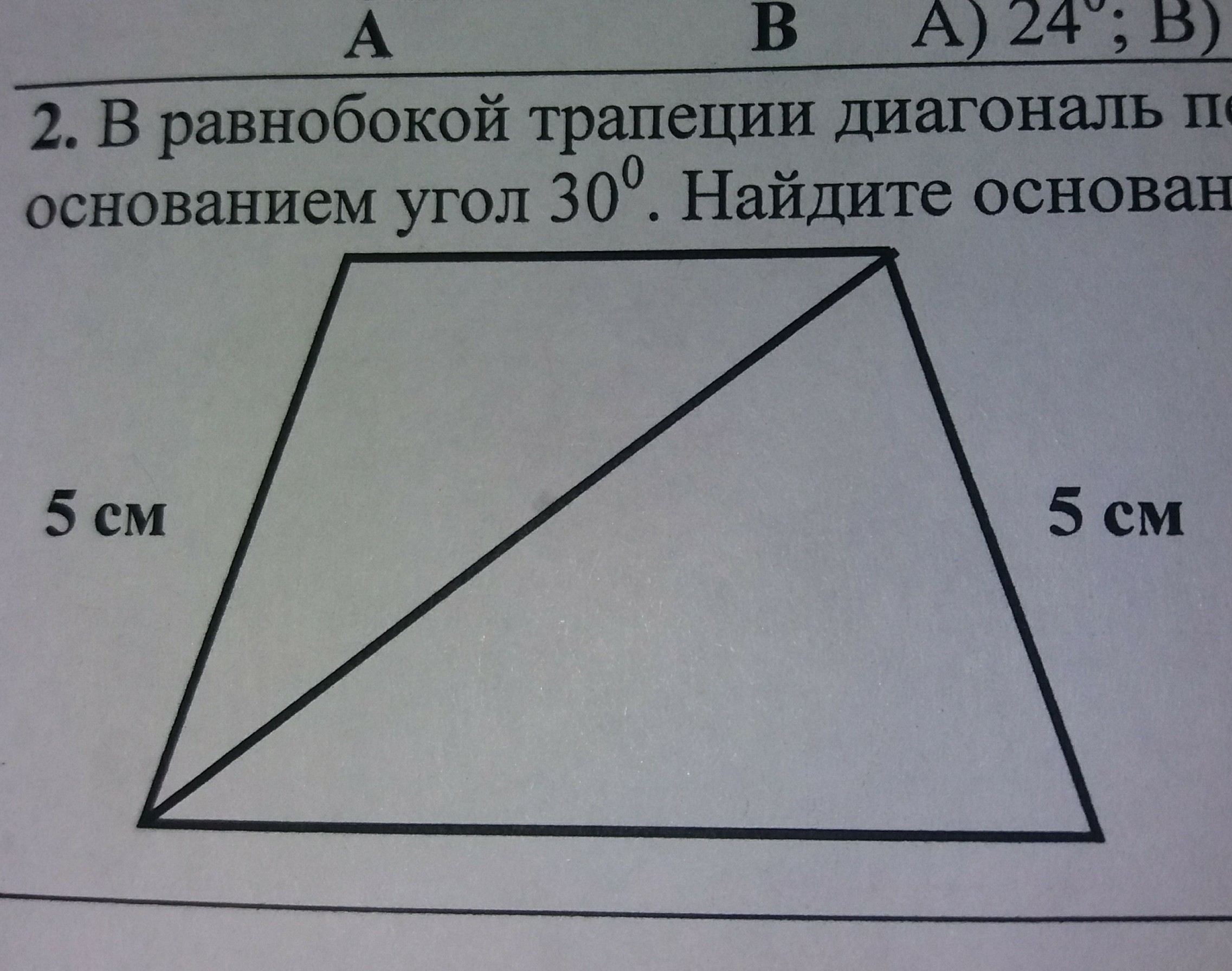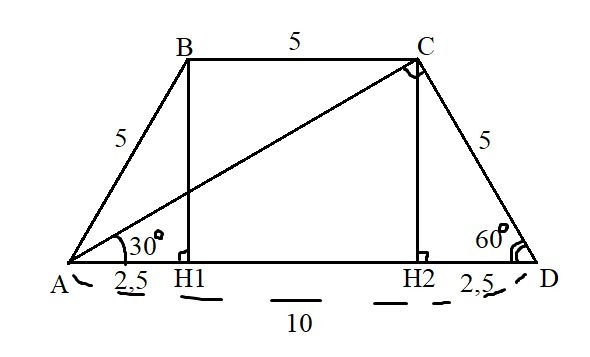 В равнобокой трапеций диагональ перпендикулярна боковой стороне и образует с большим снованием угол 30 ° . Найдите основания трапеций,если ее боковая сторона равна 5 см