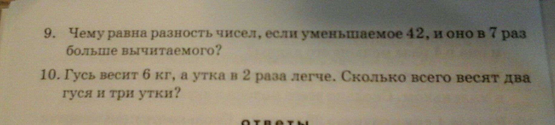 - задание 10 1)6 разделить на 2 получаем 3 кг весит утка.2)6 умножаем на 2 получаем 12 кг весят 2 гуся.3)3 умножаем на 3 и получаем 9 кг весят 3 утки .4) 12плюс 9 получаем 21 это весят 2 гуся и 3 утки