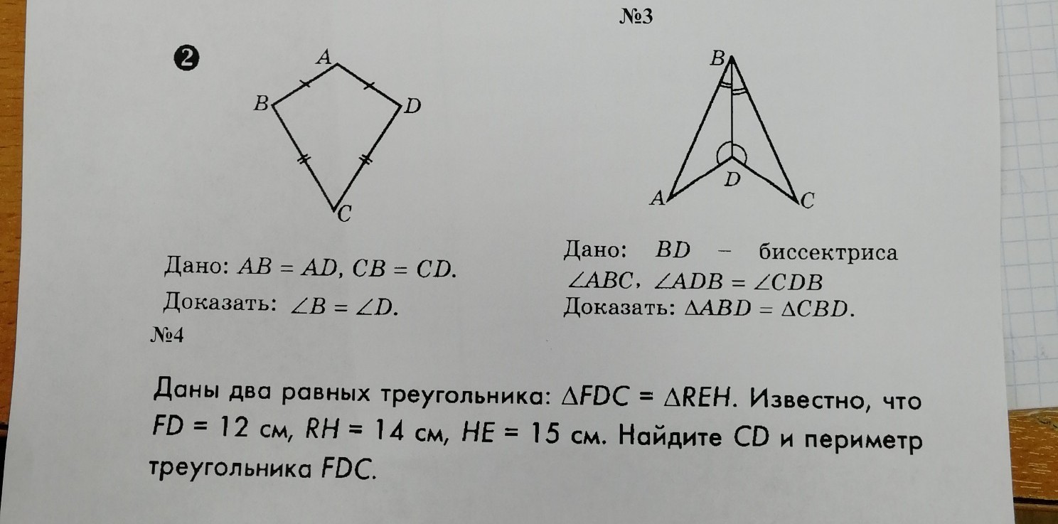 1) по условию нам известно, что АВ=АD и СВ=СD. из этого мы можем вынести, что что раз эти стороны равны между собой, то они составляют одинаковые углы, из чего следует угол В = угол D.