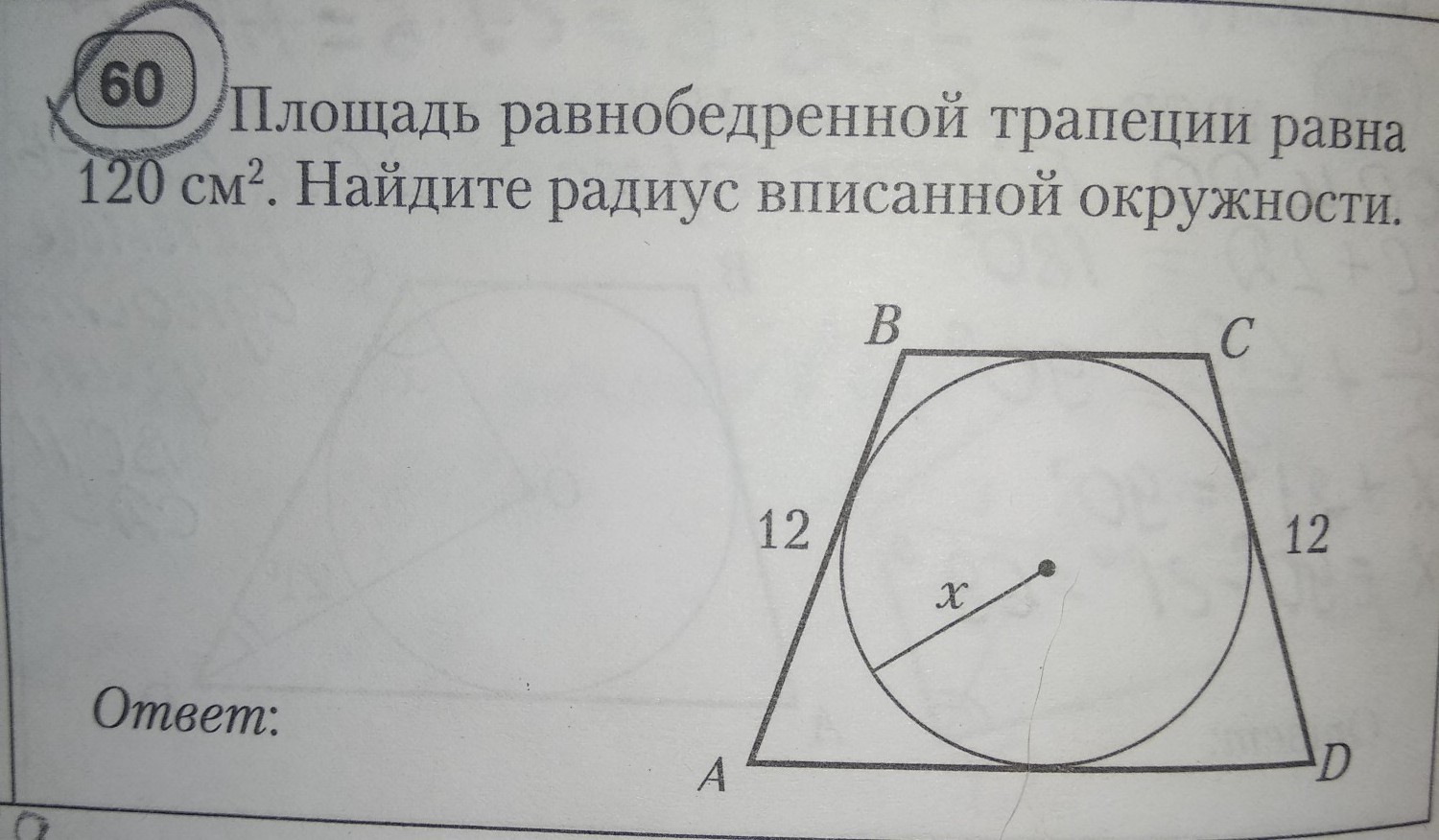 Сумма оснований описанной трапеции равна сумме боковых сторон, то есть 24, полусумма оснований тогда 12, площадь тогда