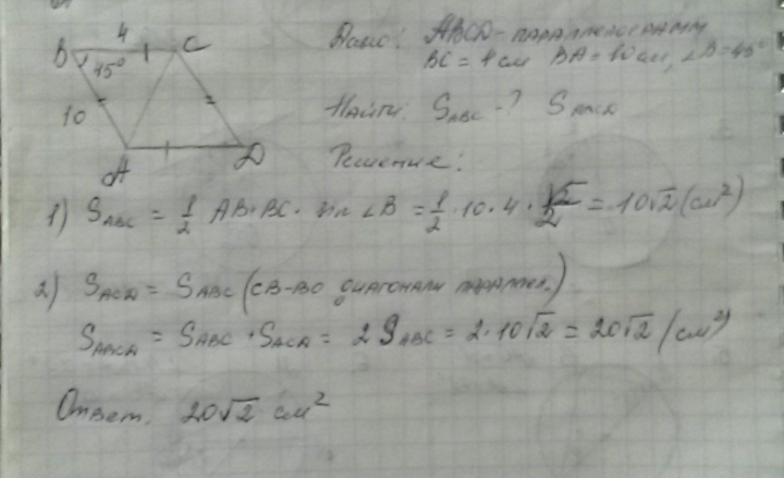 Дано: ABCD — параллелограмм, BC=4 см, BA=10 см, ∡B равен 45°. Найти: площадь треугольника S(ABC) и площадь параллелограмма S(ABCD).