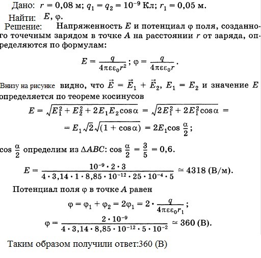 на расстоянии 8 см друг от друга в воздухе находятся два заряда 1 нКл. Определить напряженность и потенциал поля в точке находящейся на расстоянии 5 см от заряда