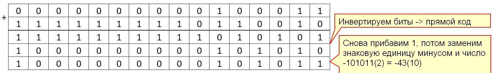 И последний шаг заключается к сложению полученного кода с единицей, что и дает дополнительной код. И опять же, знаковый бит мы не трогаем.