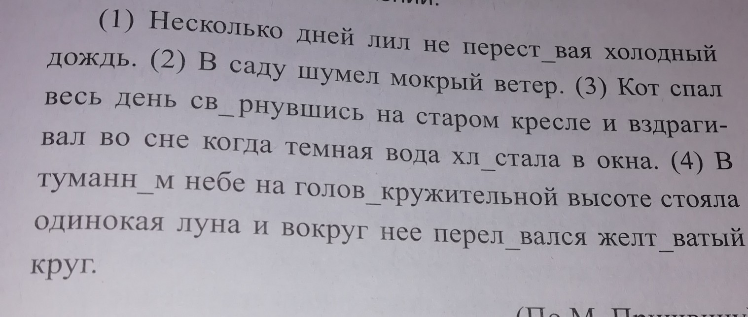 Несколько дней лил(сказуемое) не переставая холодный дождь(подлежащее).В саду шумел(сказуемое) мокрый ветер(подлежащее).Кот(подлежащее) спал(однородное сказуемое) весь день свернувшись на старом кресле и вздрагивал(однородное сказуемое) во сне,когда темная вода(подлежащее) хлестала(сказуемое) в окна.В туманном небе на головокружительной высоте стояла(сказуемое) одинокая луна(подлежащее),и вокруг нее переливался(сказуемое) желтоватый круг(подлежащее).