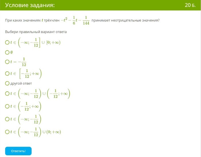 При любом значении t трёхчлен принимает отрицательные значения, кроме t=-1/12. При t=-1/12 трёхчлен равен 0, а ноль не является ни положительным ни отрицательным числом.