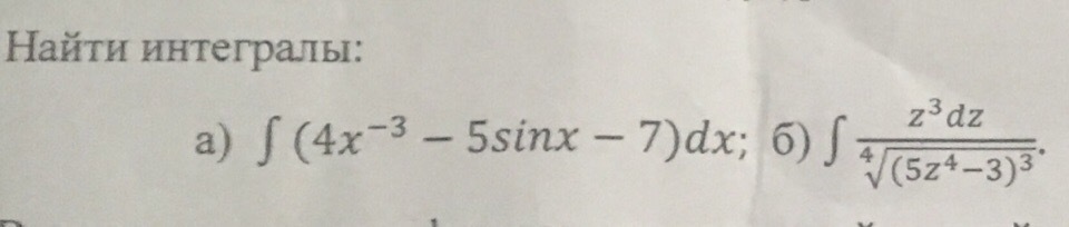 b. ∫(z³dz)/(⁴√(5z⁴-3)³)=1/20*∫1/(⁴√u³)*du=1/20*∫1/u^(3/4)*du=(⁴√u)/5+C=1/5*⁴√(5z⁴-3)+C