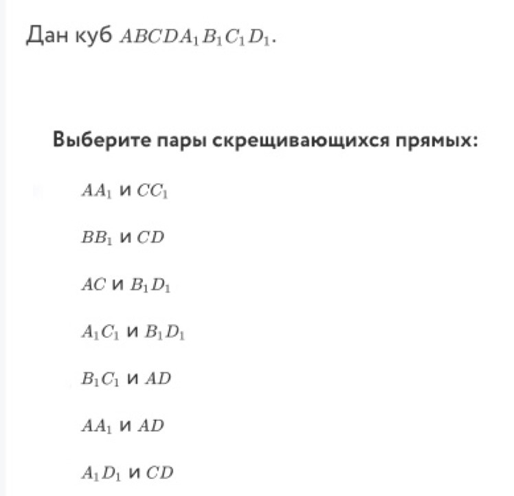 Скрещивающиеся прямые - не лежат в одной плоскости, а у тебя АА1 и СС1 , В1С1 и AD - можно расположить в одной плоскости