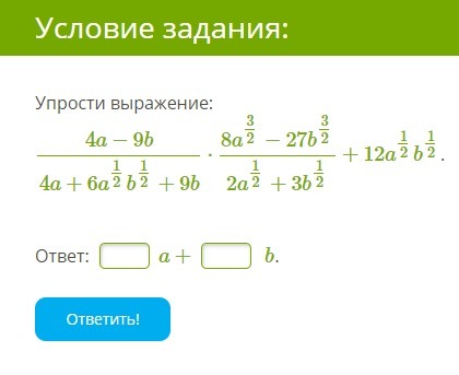 displaystylett frac{4a-9b}{4a+6a^{frac{1}{2}}b^{frac{1}{2}}+9b}cdot frac{8a^{frac{3}{2}}-27b^{frac{3}{2}}}{2a^{frac{1}{2}}+3b^{frac{1}{2}}} +12a^{frac{1}{2}}b^{frac{1}{2}}= \\\ =frac{(2a^{frac{1}{2}}-3b^{frac{1}{2}})(2a^{frac{1}{2}}+3b^{frac{1}{2}})}{4a+6a^{frac{1}{2}}b^{frac{1}{2}}+9b}cdot frac{(2a^{frac{1}{2}}-3b^{frac{1}{2}})(4a+6a^{frac{1}{2}}b^{frac{1}{2}}+9b)}{2a^{frac{1}{2}}+3b^{frac{1}{2}}} +12a^{frac{1}{2}}b^{frac{1}{2}}=