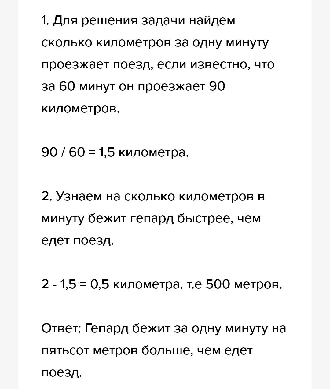 Поезд едет со скоростью 90км/ч а рядом с ним бежит гепард со скоростью 2 км/мин кто движется быстрее записи ответ и объясни его
