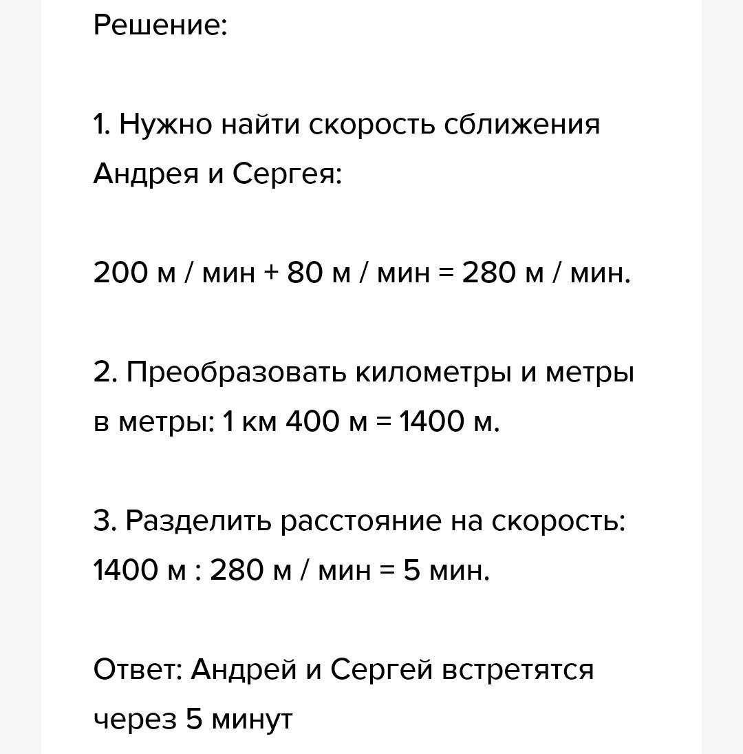 Андрей едет на велосипеде 200м/мин Сергей идёт пешком 80м/мин Через сколько минут они встретятся если сейчас расстояние между ними 1км 400м?