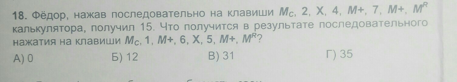 будет ответ в : 31 (1 нажали, клавиша запомнить, запомнили 1. 6х5=30. клавиша прибавить =30+1=31)
