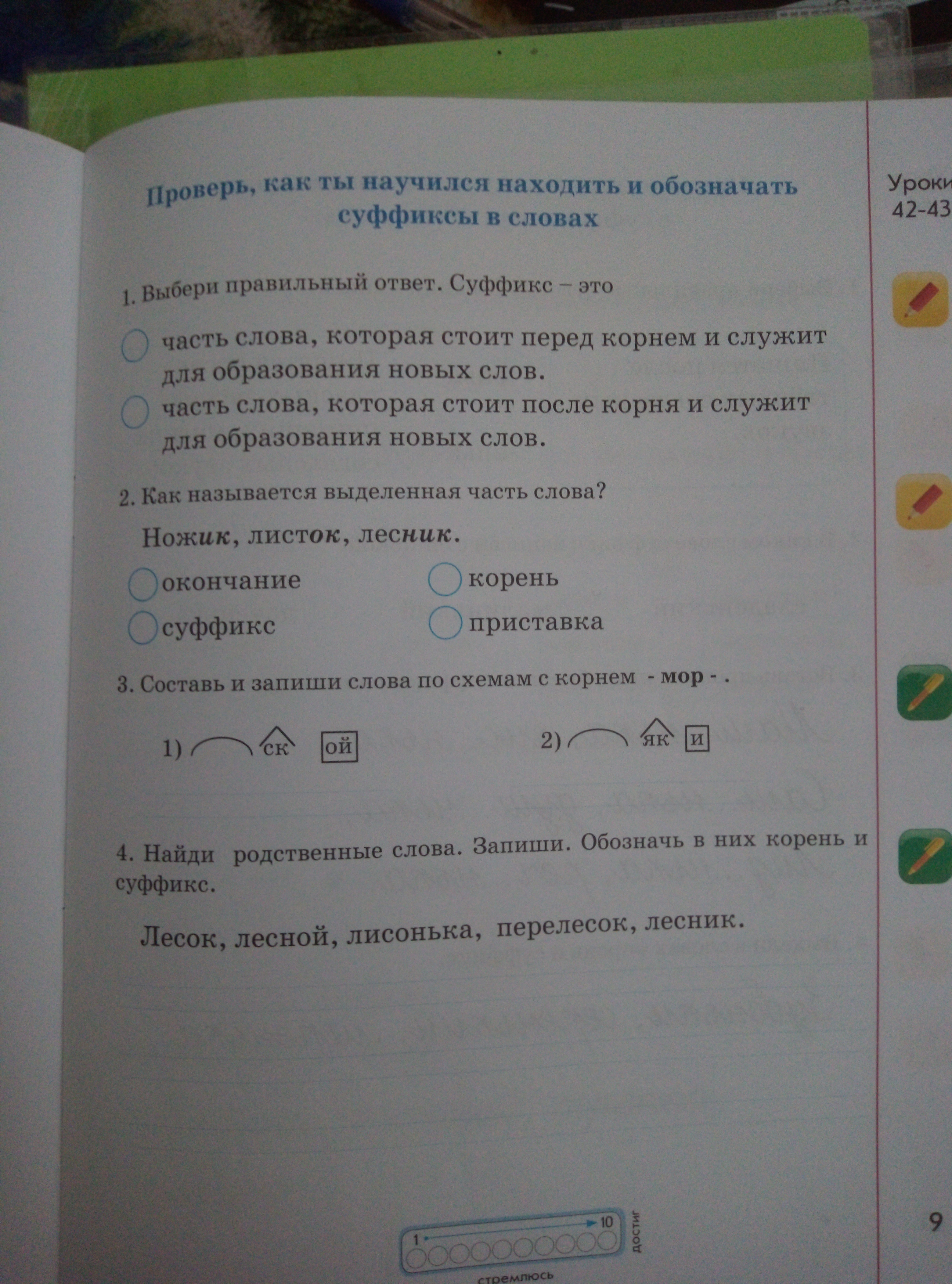 4)Лесок, лесной, лесник- корень "лес", суффиксы- "ок","н","ник".