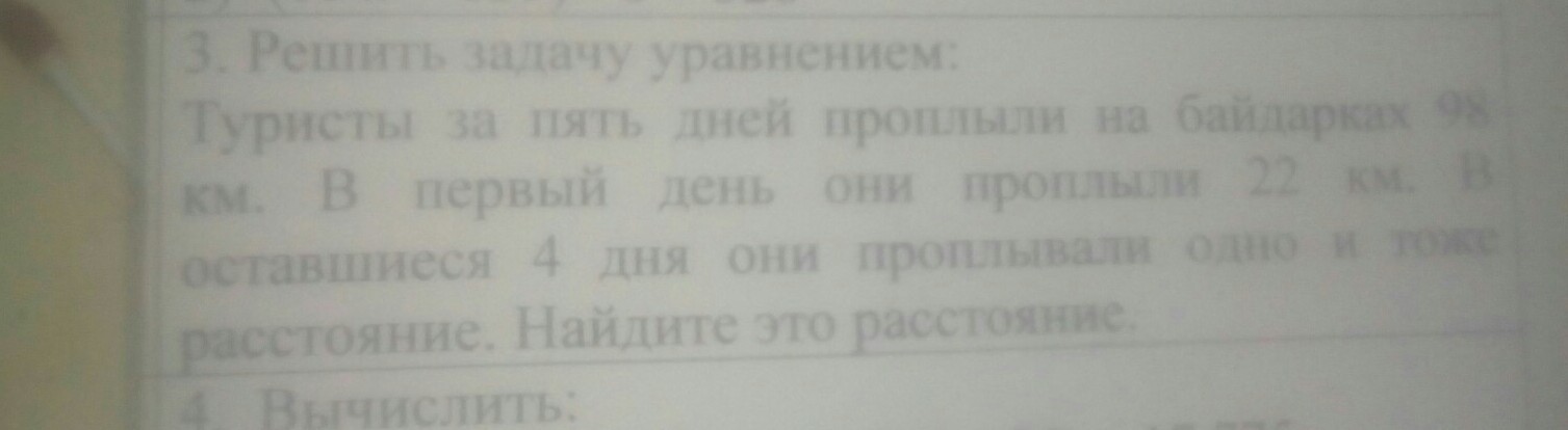 1) 98-22=76 км осталось проплыть за 4 дня.