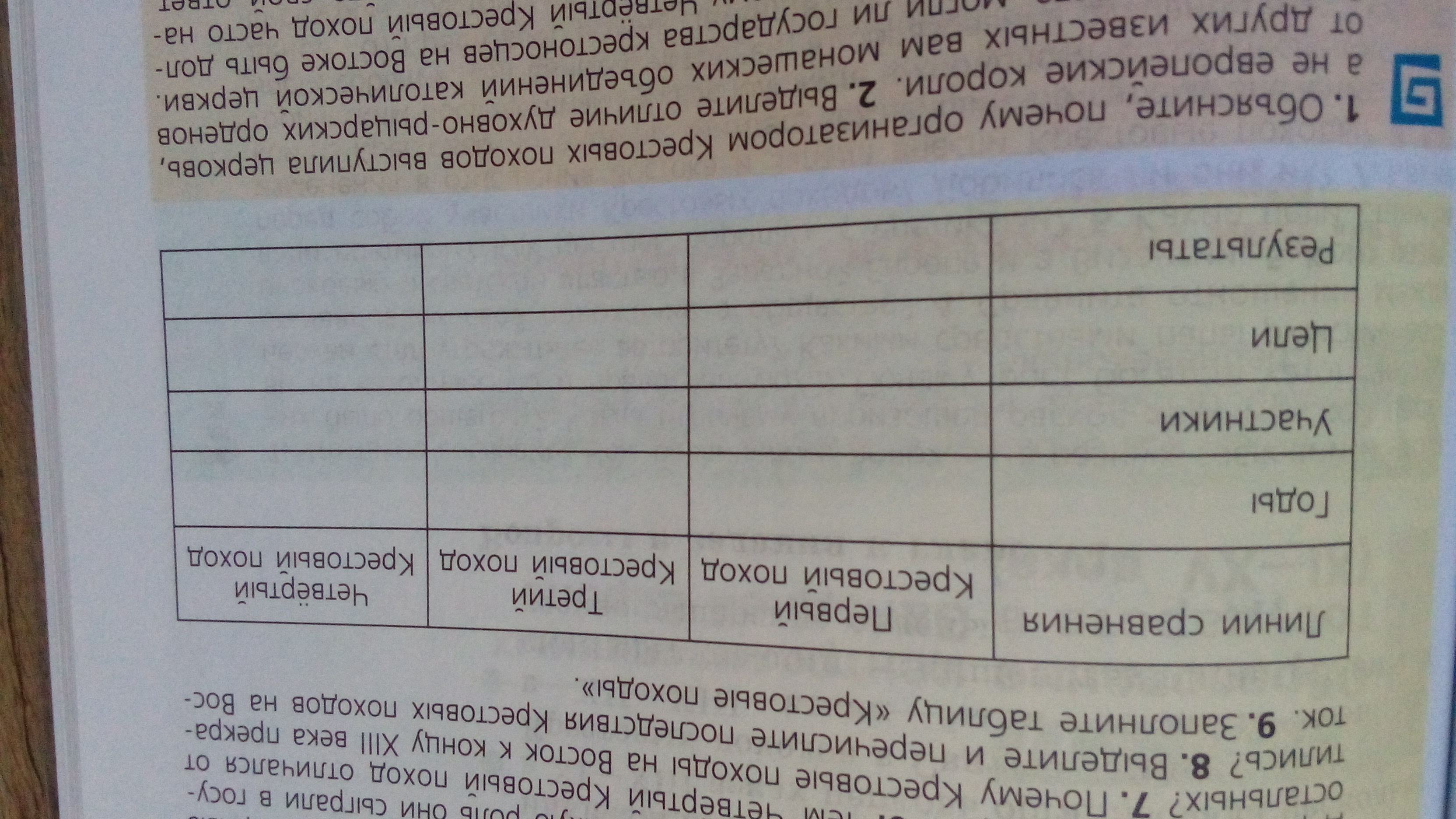 первая строка - год 1096, участн. - Урбан || , Алексей |, цель - помощь восточным христианам и освобождение от мусульман Иерусалима и святой земли, исход - основание Иерусалимского королевства и д.р.