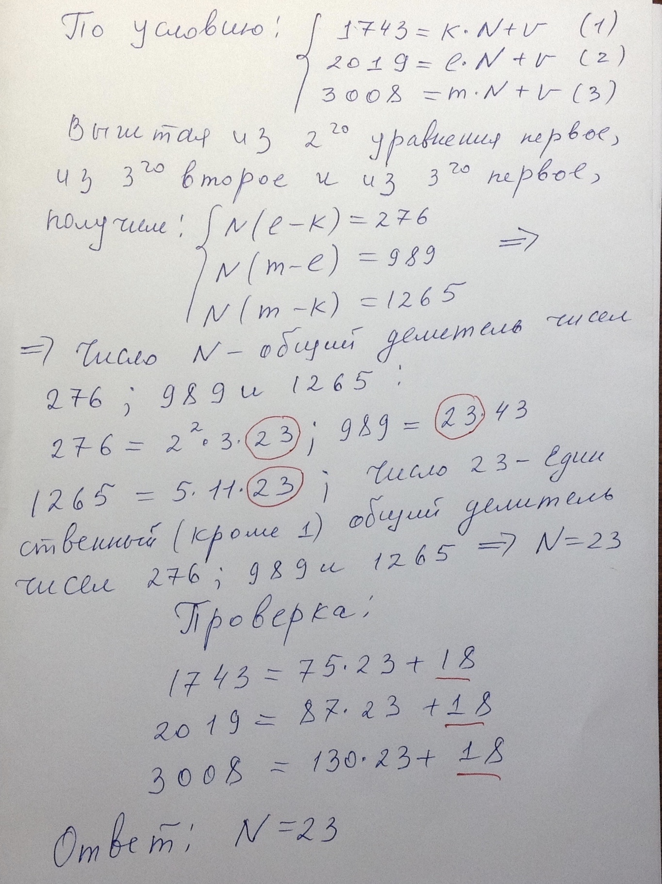 Найдите натуральное число N(N>1) если числа 1743, 2019 и 3008 дают одинаковые остатки при делении на N.