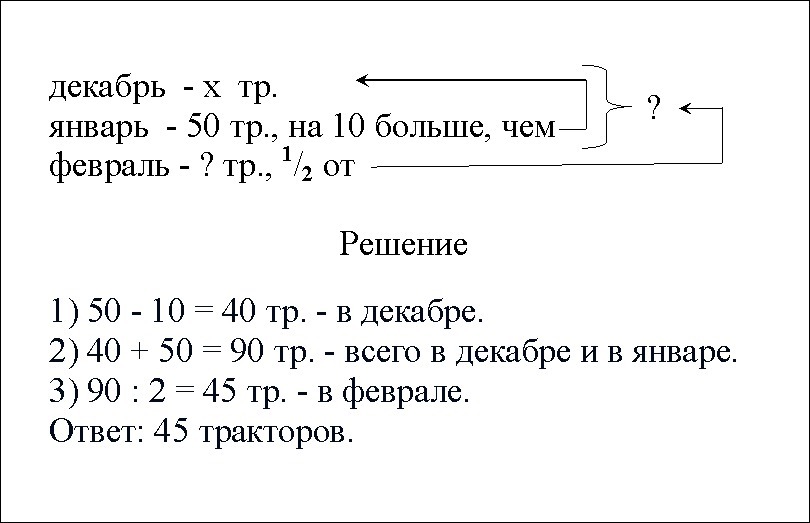 за январь на заводе изготовили 50 тракторов что на 10 больше чем в декабре. В феврале выпустили Половину того,что в январе и декабре вместе.сколько тракторов выпустили феврале?помогите составить условие задачи?