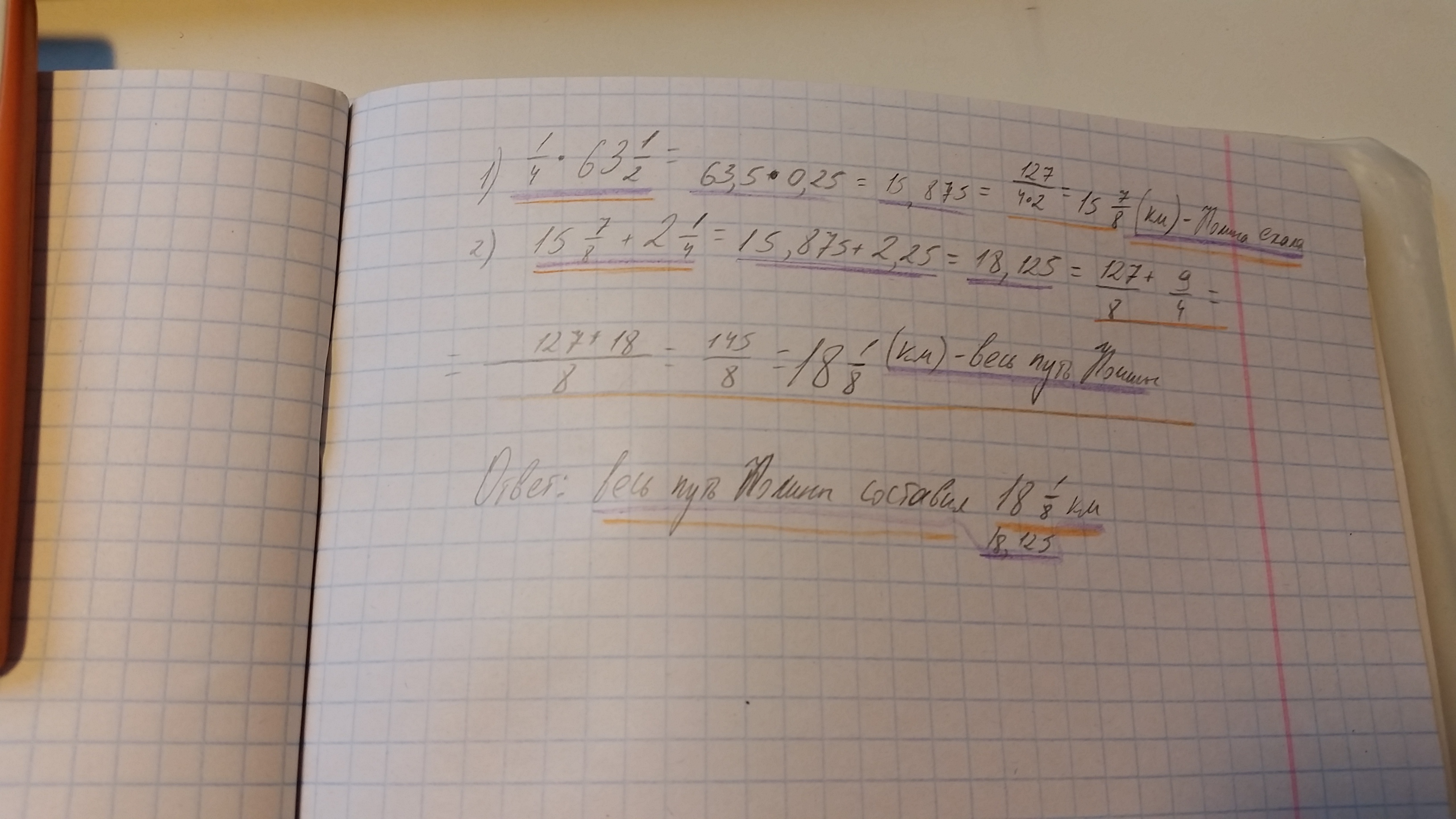 Полина ехала до дачи 1/4 часа со скоростью 63,1/2 км/ч и шла пешком 2,1/4 км. Найдите путь, который проделала Полина. Напишите решение и ответ.