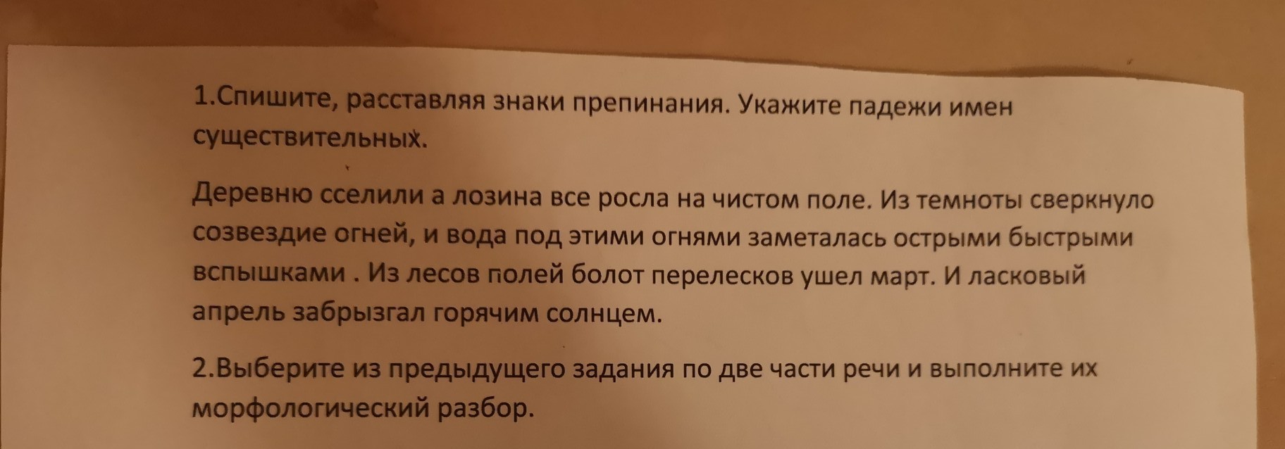 1. Деревню(В.п.) сселили, а лозина(И.п.) всё росла на чистом поле(В.п.). Из темноты(Р.п.) сверкнуло созвездие(И.п.) огней(Р.п.), и вода(И.п.) под этими огнями(Т.п.) заметалась острыми быстрыми вспышками(Т.п.). Из лесов(Р.п.), полей(Р.п.), болот(Р.п.), перелесков(Р.п.) ушёл март(И.п.). И ласковый апрель(И.п.) забрызгал горячим солнцем(Т.п.)...2. Деревню - имя сущ-ное, обозначает признак предмета, н.ф.-деревня (что?), ж.р, 1 скл, неодуш, нариц, ед.ч, В.п., дополнение. Солнцем - имя сущ-ное, обозначает предмет, н.ф.-солнце (что?), ср.р, 2 скл, неодуш, нариц, ед.ч, Т.п., дополнение. Острыми - имя прилаг-ное, обозначает признак предмета, н.ф.-острый (какой?), качеств, полная форма, мн.ч, Т.п., определение. Ласковый - имя прилаг-ное, обозначает признак предмета, н.ф.-ласковый (какой?), качеств, полная форма, ед.ч, И.п., определение.