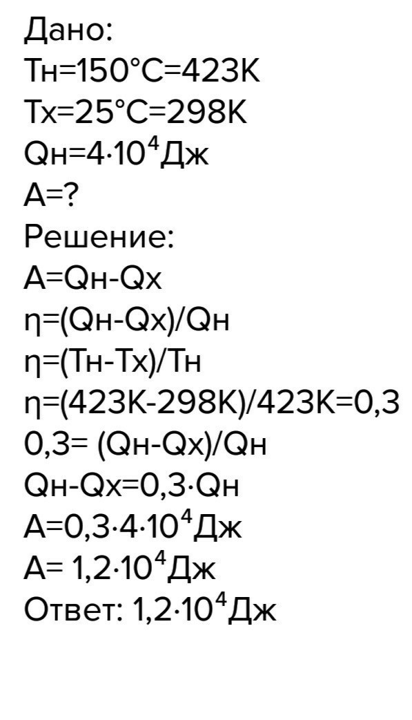 Температура нагревателя тепловой машины 150 градусов цельсия , а холодильника 25 градусов цельсия. Машина получила от нагревателя 40 кДж энергии. Какова работа, произведенная машиной.