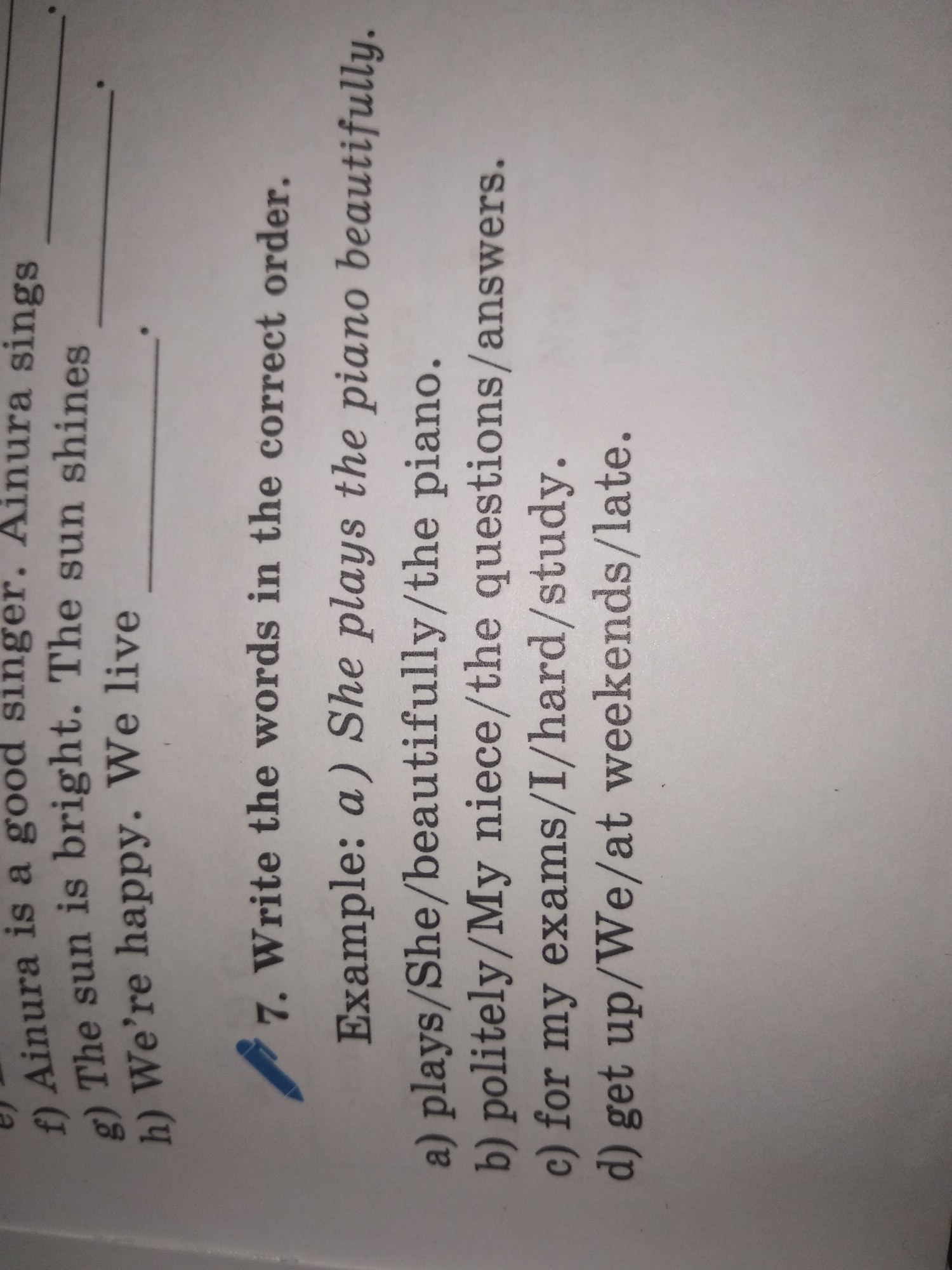 She plays the piano beautifully. My niece answers the questions politely. I study for my exams hard. We get up at weekends late.