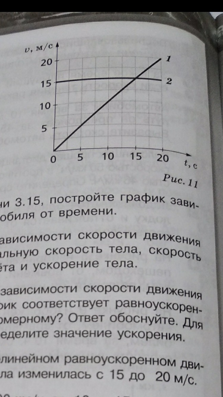 на рисунке 11 изображены графики зависимости скорости движения от времени для двух тел.Какой график соответствует равноускоренному движению тела,а какой равномерному?Ответ обоснуйте.Для тела, движущегося с ускорением ,определитезначения ускорения.