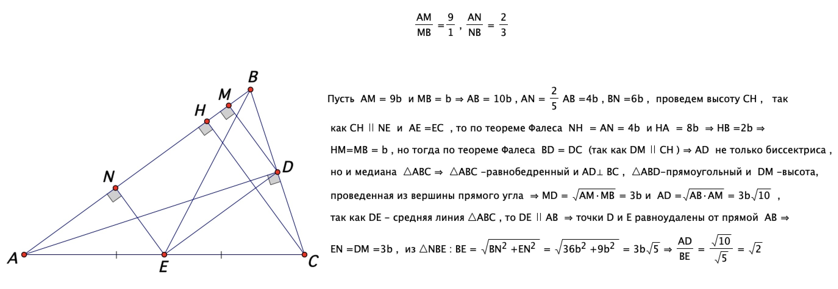 В остроугольном треугольнике ABC проведены биссектриса AD и медиана BE. Точки M и N являются ортогональными проекциями точек D и E соответственно на сторону AB, причём AM : MB = 9 : 1, AN : NB = 2 : 3. Найдите отношение AD : BE.